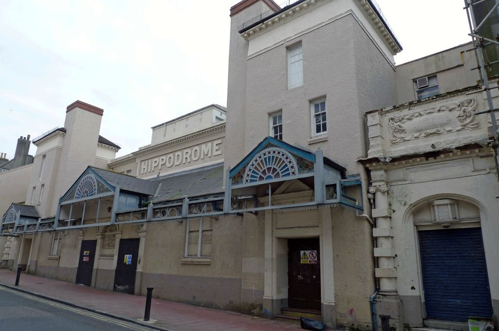 ![]() In 1964 the Hippodrome was used as a location in the film Be My Guest (released April 1965). These stills from a short scene of a couple arriving at the theatre—clearly shot in the middle of the night, when the theatre and Middle Street look forlorn—show the entrance in its dying days as a variety theatre. Note that the canopy has all but disappeared. |